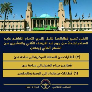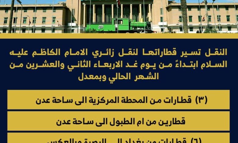 وزارة النقل تسير قطاراتها لنقل زائري الامام الكاظم عليه السلام ابتداءً من يوم غد الاربعاء الثاني والعشرين من الشهر الحالي ،وبواقع